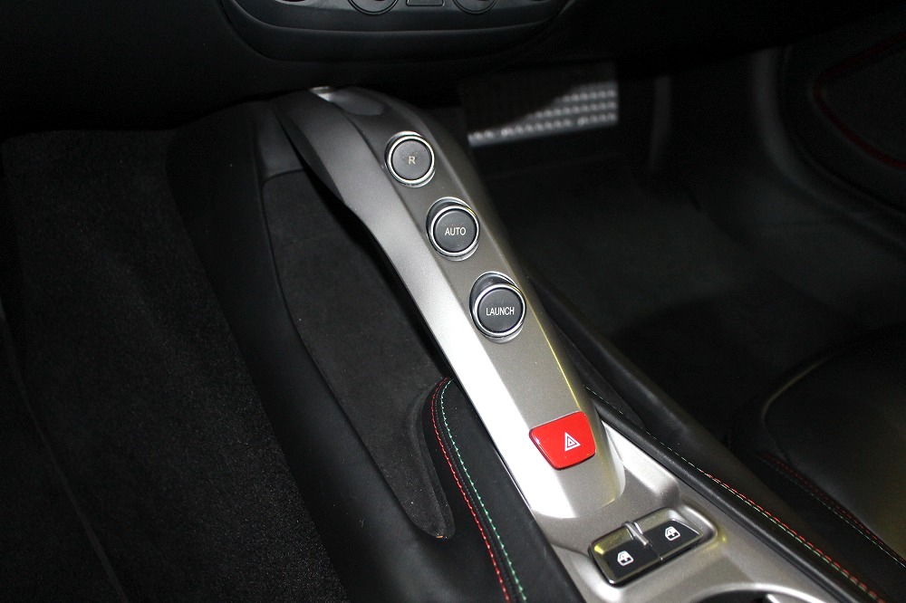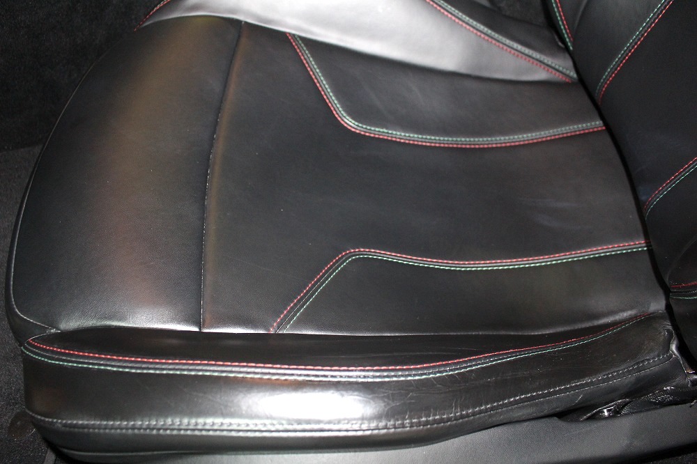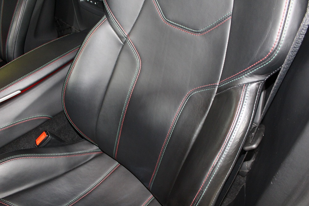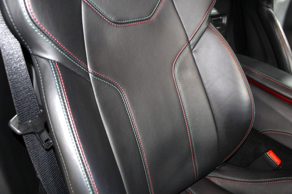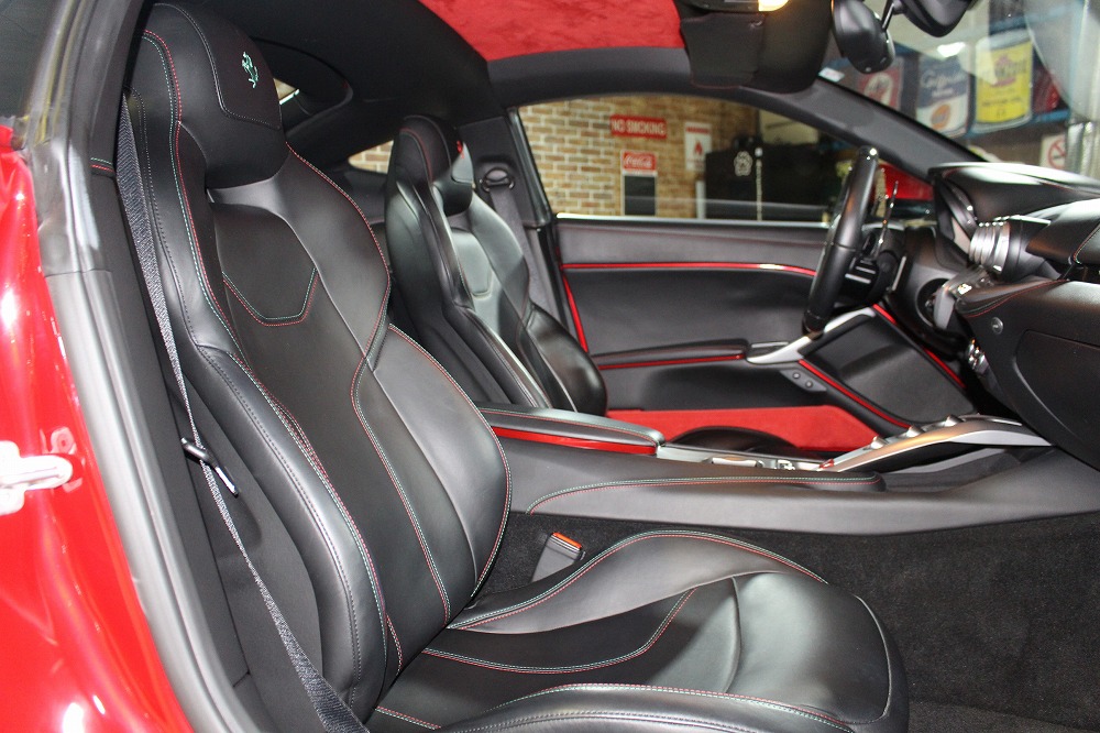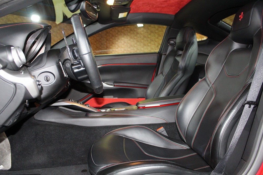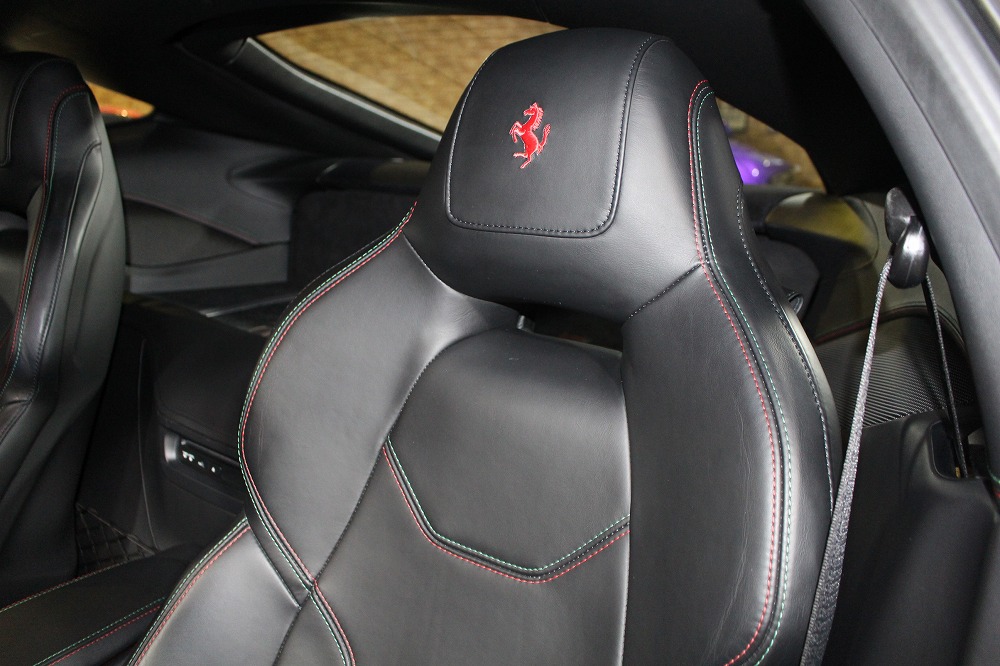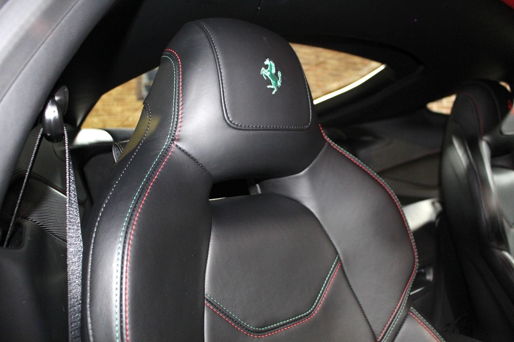 インテリアはブラックレザーを基調に、レッド×グリーンのイタリアンステッチや跳ね馬刺繍入りシートなど、細部にまでこだわりが感じられる上質な仕上がり。