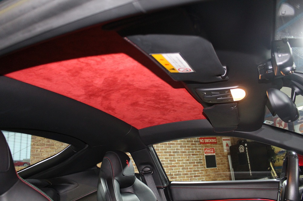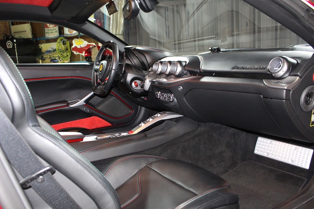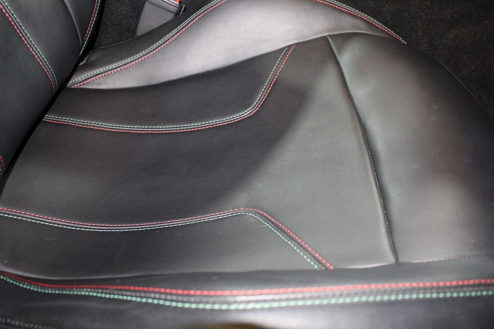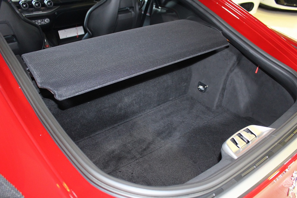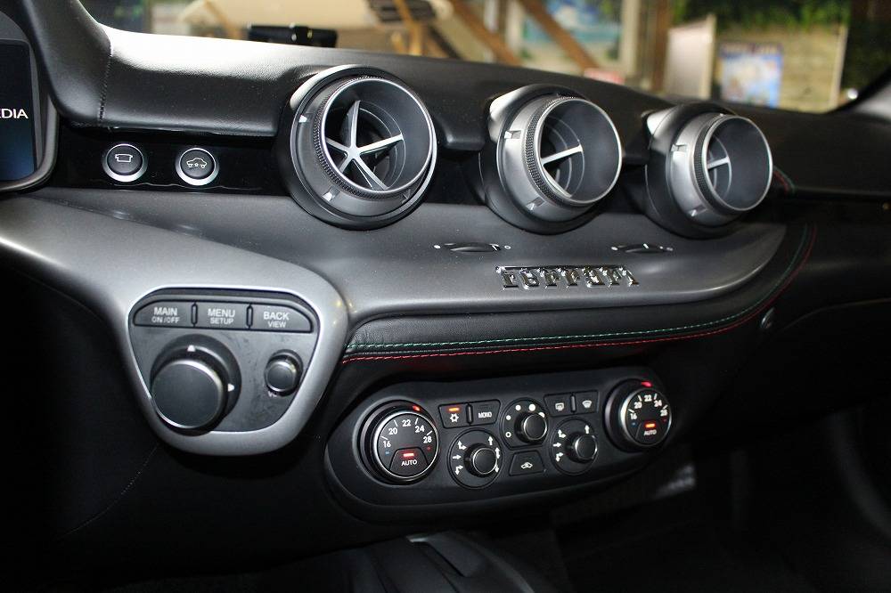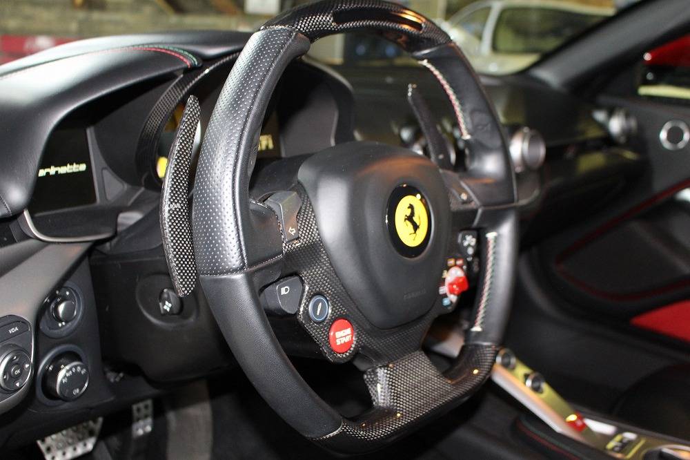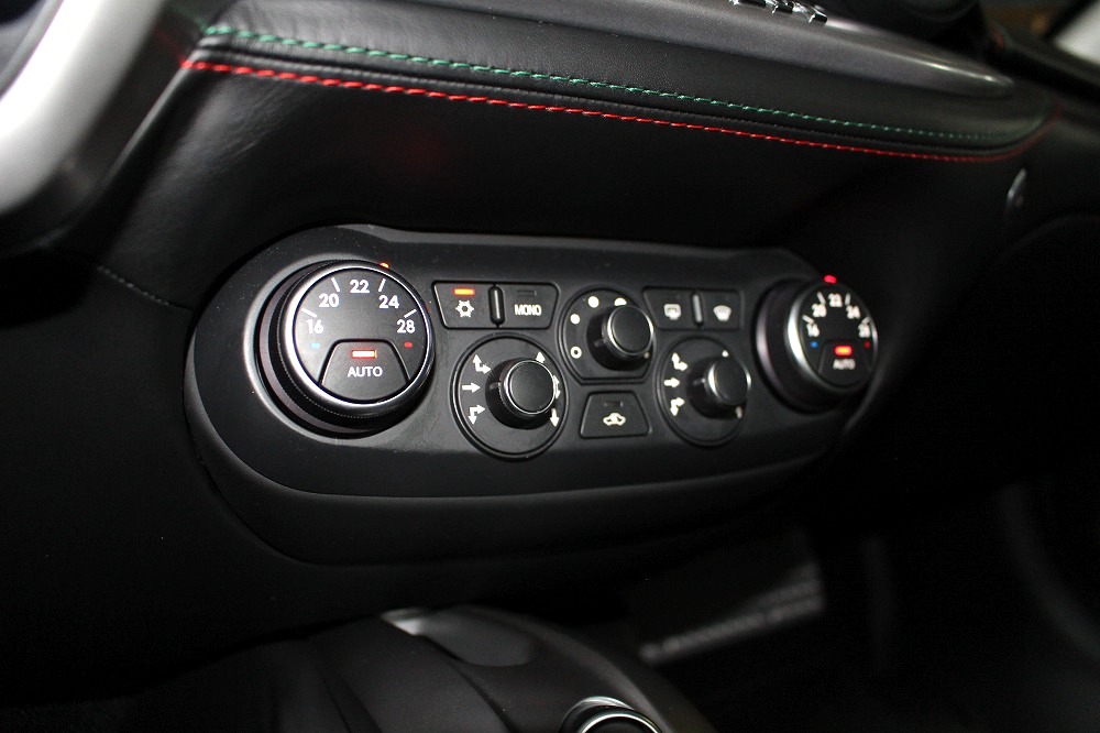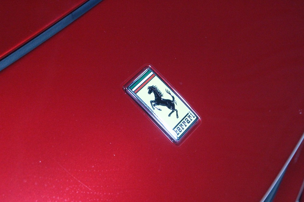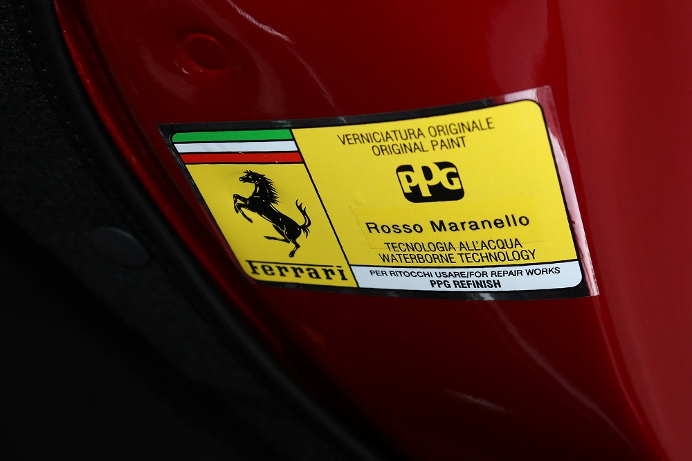 インテリアはブラックレザーを基調に、レッド×グリーンのイタリアンステッチや跳ね馬刺繍入りシートなど、細部にまでこだわりが感じられる上質な仕上がり。
