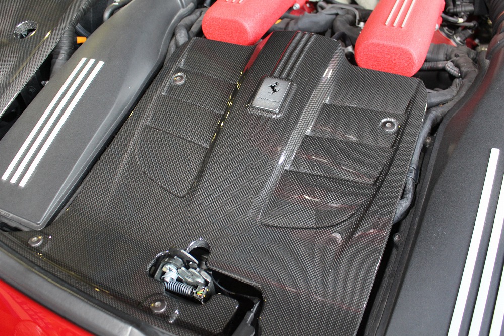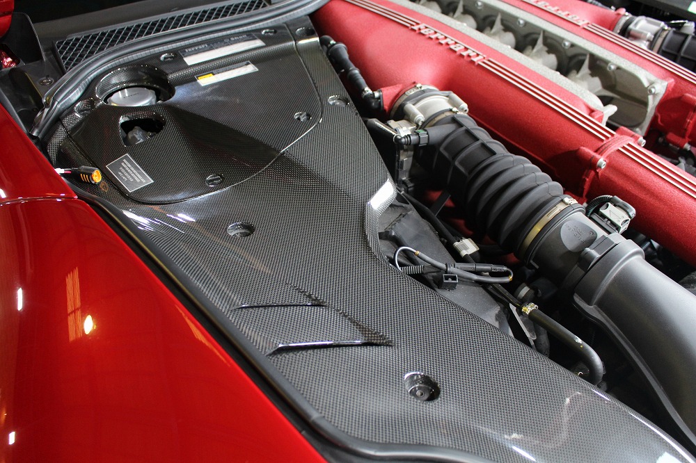 エンジンルームにはカーボンパーツがあしらわれ、見た目の迫力とメンテナンス性を両立しています。
